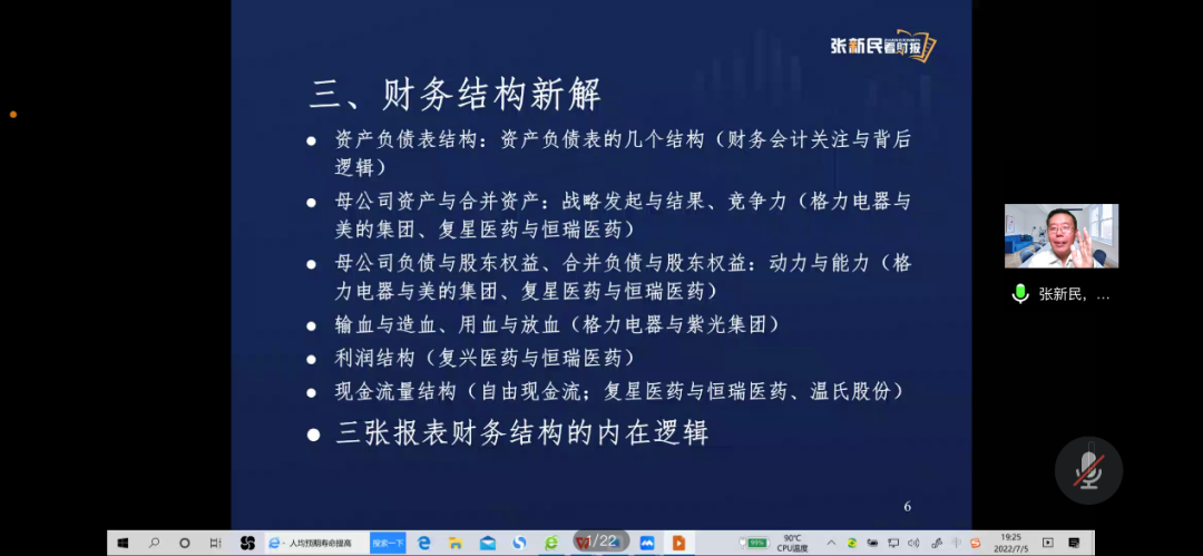 2022年7月5日晚,财政部会计名家张新民教授应邀为我院师生及会计学系校友做了以《企业战略,财务结构与竞争力分析》为主题的线上讲座。
