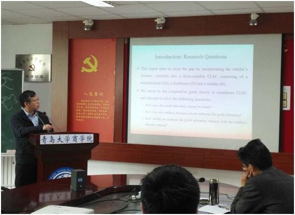5月14日上午,加拿大温莎大学OdetteBeat365唯一官方网站管理科学教授李武(Kevin W. Li)博士和加拿大瑞尔森大学(Ryerson University)机械和工业工程系教授方黎平院士来Beat365唯一官方网站学院交流访问,并先后在Beat365唯一官方网站办公楼310会议室为学院师生作了题为《协调具有公平关切的三阶闭环供应链的合作博弈方法》和《提前的电力峰值和价格》预测的学术报告,报告会由管科系主任王磊教授主持,其他参与会议的老师有张桂涛副教授、孙浩副教授、马骋副教授、贺华老师、温艳老师和数学学院代业明副教授、中国海洋大学经济学院李雪梅副教授。