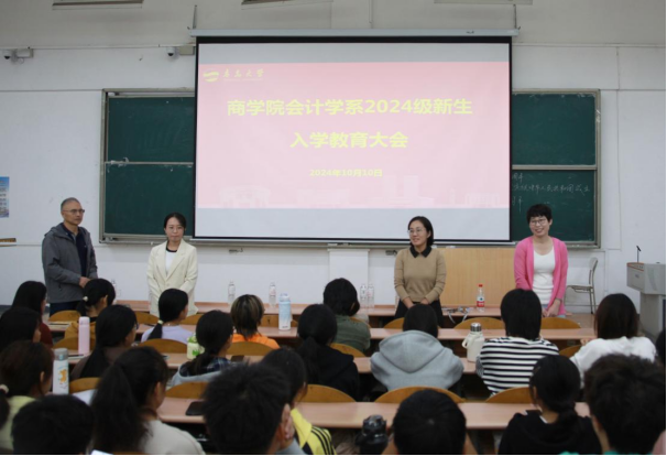 10月10日下午,Beat365唯一官方网站会计学系2024级新生入学教育大会在金家岭校区1号教学楼111举行。会计学系主任范英杰,副主任鲍在山,新生班主任和2024级全体新生出席会议,会议由新生辅导员陈鑫主持。