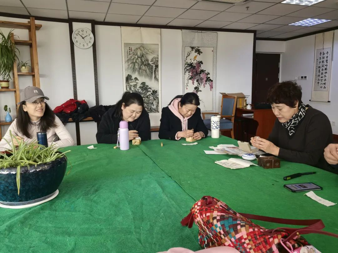 青岛市妇女儿童活动中心的篆刻体验区弥漫着古朴厚重的文化气息。篆刻专家从印石打磨、印稿设计、奏刀技法等方面进行讲解,带领教职工感受“方寸之间,气象万千”的金石魅力。女教职工们执刀刻石,全神贯注于笔画的转折与线条的力道,刻刀与青田石碰撞出细碎清响,美妙的篆体印文逐渐显现。活动特别设置“姓名章定制”环节,许多老师将人生第一枚手工印章视若珍宝:“一刀一刻皆是心性的修炼,这份‘中国式浪漫’让人着迷。”