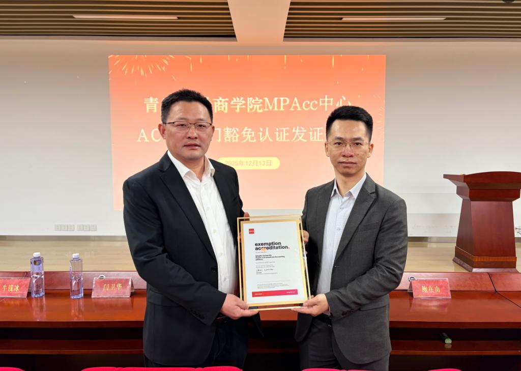 仪式核心环节中,张磊与胡景皓共同签署合作协议。握手签约的瞬间、证书交接的时刻,不仅定格了双方深度合作的重要节点,更意味着青大MPAcc学子将享受国际顶级财会资格认证的专属福利,职业发展之路自此更添助力。