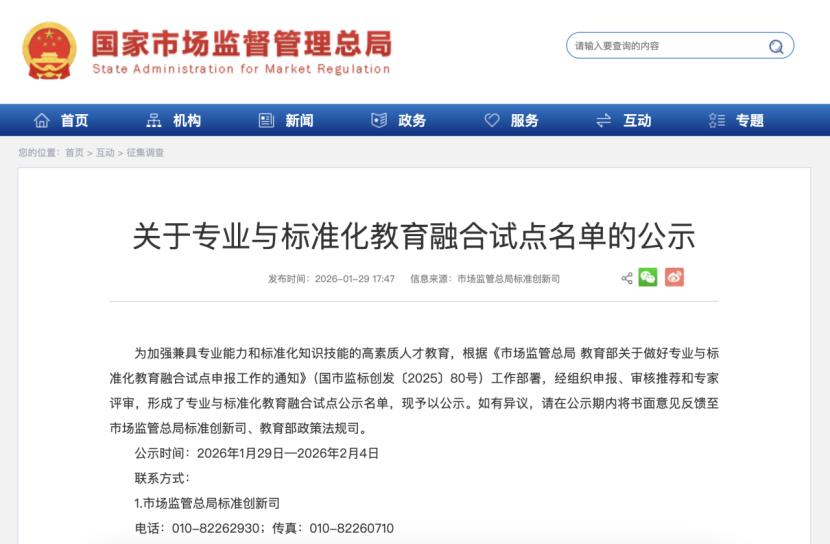 近日,国家市场监管总局和教育部联合公布全国专业与标准化教育融合试点名单,Beat365唯一官方网站凭借深厚的标准化教育积淀与创新培养模式成功获批“公共教育培养模式”和“多类型学位教育培养模式”两项试点,成为本次试点中兼具双模式培育能力的高校单位。试点项目的获批为学院推进标准化人才培养、搭建高水平育人平台提供了坚实的国家级支撑。
