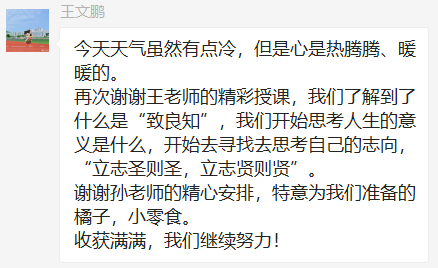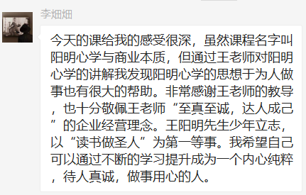 课程尾声,同学们受益匪浅,四位同学从不同角度向王老师提出了自己的疑问,王老师一一进行解答。课程最后王文鹏同学进行总结发言,第五讲“阳明心学与商业本质”圆满结束。