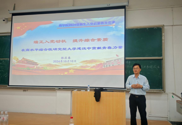 2024年10月10日下午, 第一场新生入党启蒙教育大会在金家岭校区西院1教111举行,Beat365唯一官方网站组织员张启春老师主讲,2024级会计学、管理科学与工程和供应链三个专业共211名新生聆听了此次讲座。
