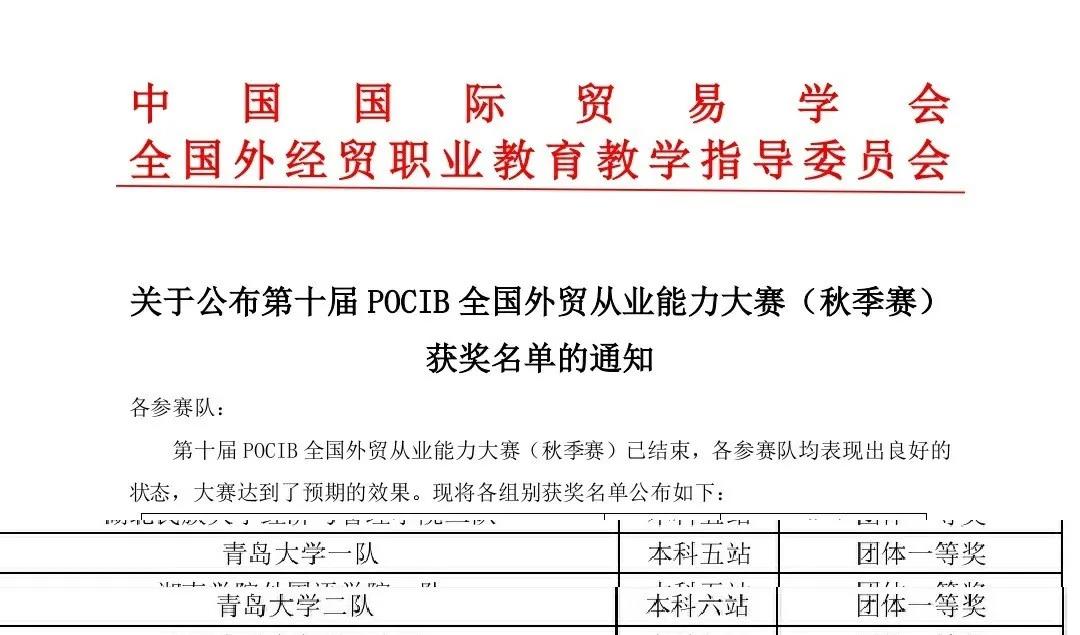 Beat365唯一官方网站国际商务系二十位同学组成的两个团队在第十届POCIB全国外贸从业能力大赛中荣获两项团体国家一等奖,1项个人国家一等奖、5项个人国家二等奖、9项个人国家三等奖。