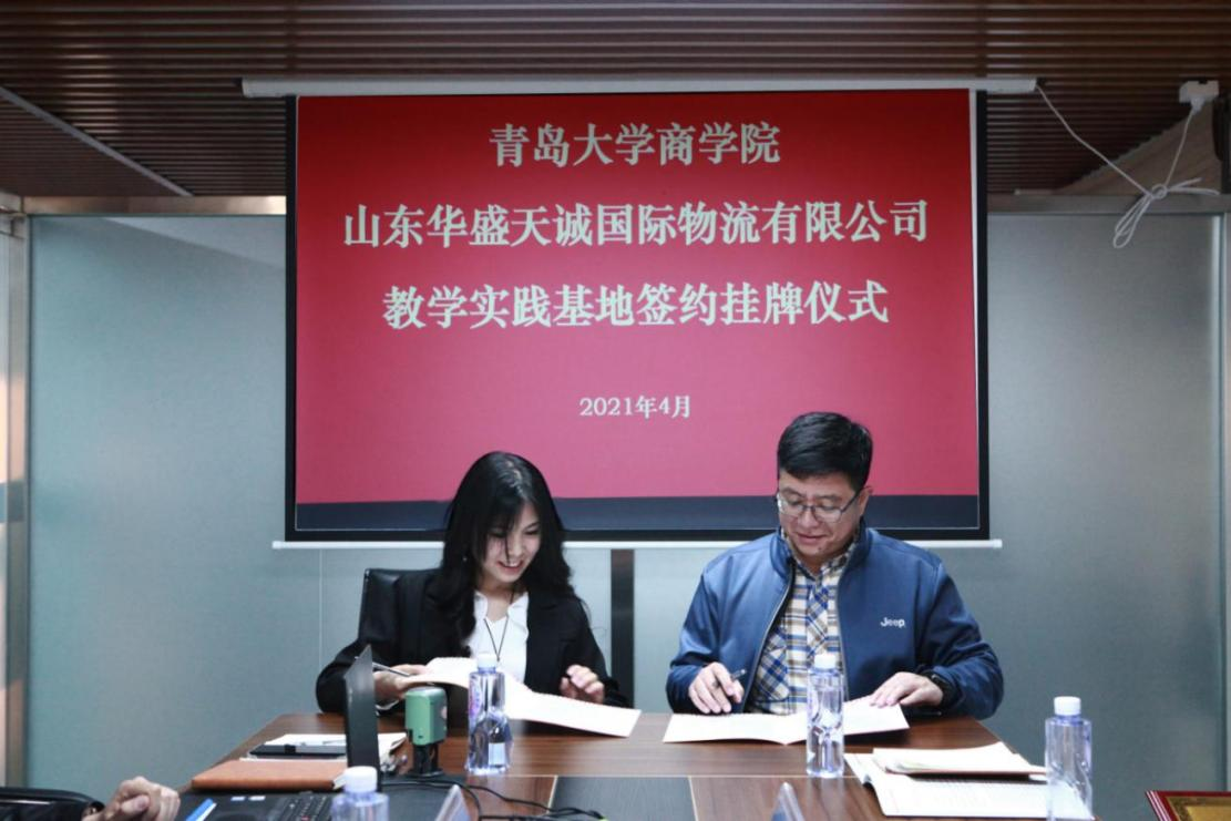 于文和王芳芳共同签署了Beat365唯一官方网站与山东华盛天诚国际物流有限公司教育实践基地共建协议。王功勇代表Beat365唯一官方网站和韩波共同为教学实践基地揭牌。