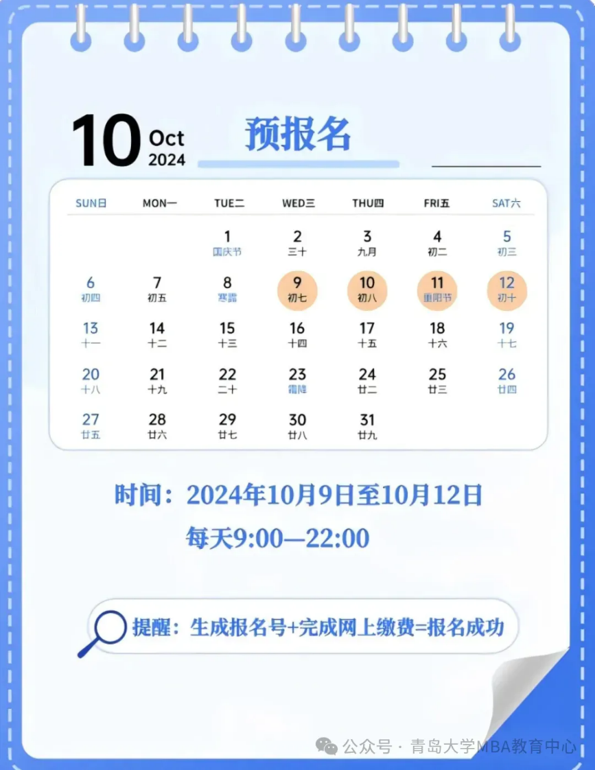 网上预报名时间:2024年10月9日至10月12日,每天9:00—22:00。