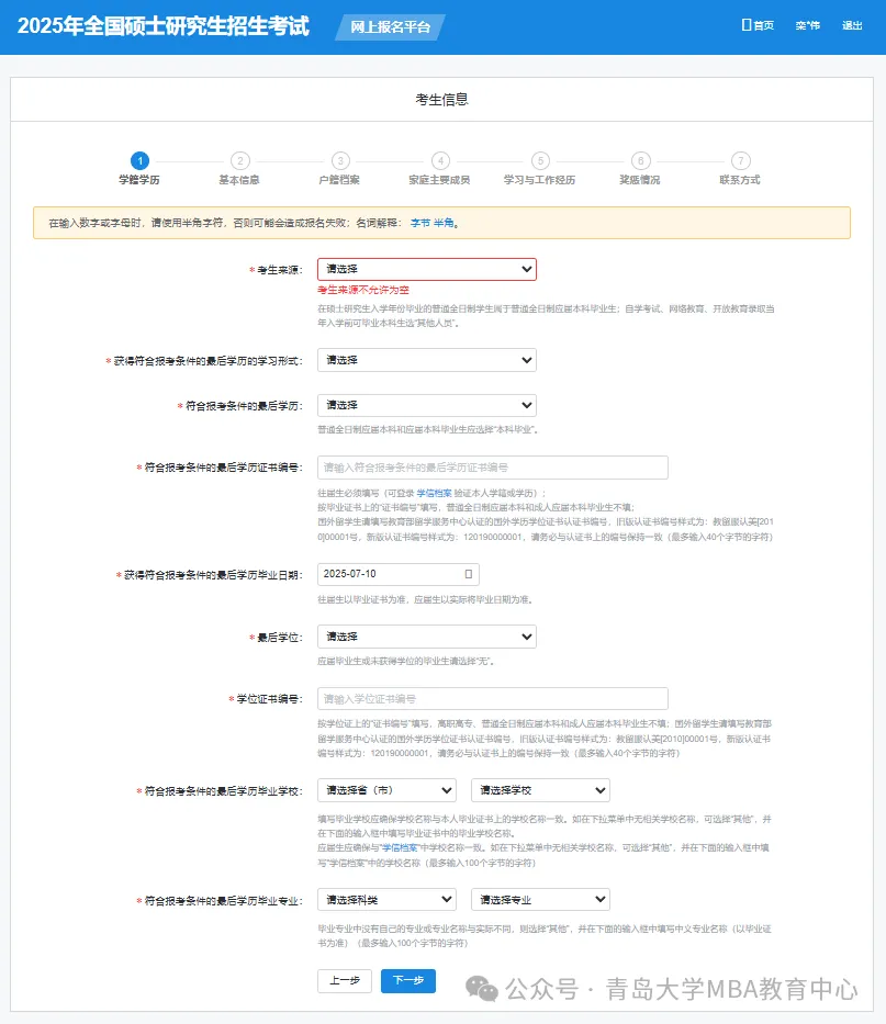 (3)填写考生信息。①考生信息包括学籍学历、基本信息、户籍档案、家庭主要成员、学习与工作经历、奖惩情况、联系方式,考生应认真阅读报名页面的提示信息,如实准确填写:②考生必须使用半角英文输入法填写信息,带*的文本框为必填内容;③考生填写的学历(学籍)信息系统会进行校验,校验结果供考生查看,未能通过学历(学籍)网上校验的考生应在招生单位规定时间内完成学历(学籍)核验;⑤家庭主要成员、学习与工作经历等内容,每部分都需要至少完整填写一条信息;