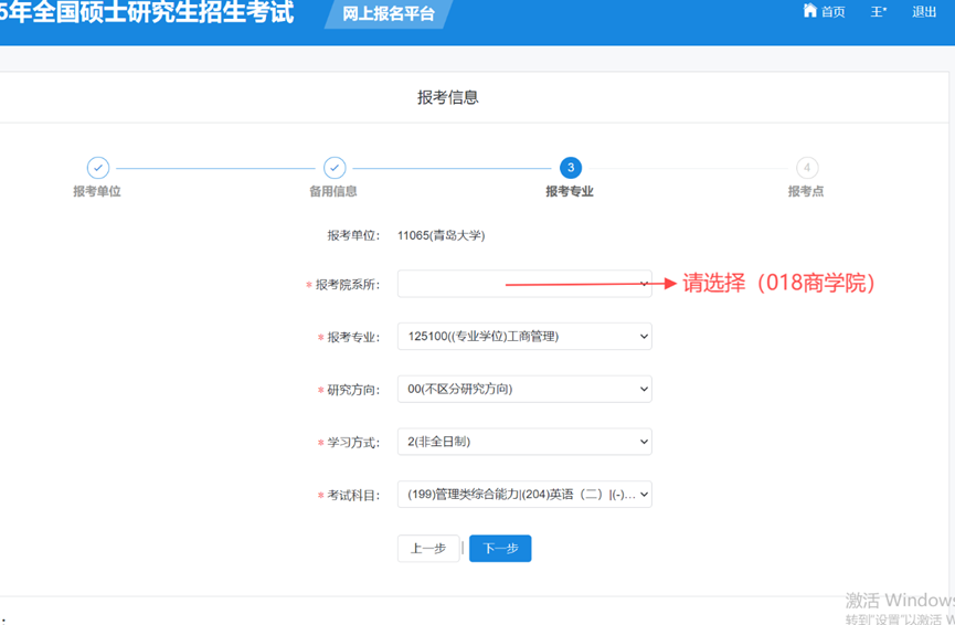 (5)选择报考专业、研究方向以及考试科目。报考专业名称前面有“(专业学位)”字样的为专业学位类别领域,其他为学术学位学科专业;