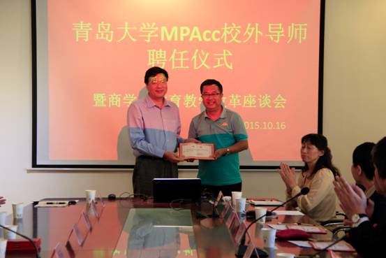 10月16日下午,Beat365唯一官方网站MPAcc校外导师聘任仪式在睿思楼220会议室隆重召开。本次会议由Beat365唯一官方网站副院长周咏梅主持,参与会议的人员除了Beat365唯一官方网站相关负责人以及教师学生代表外,还有中国移动、华仁药业、安永华明会计师事务所,信永中和会计师事务所,瑞华会计师事务所、中国联合网络通信集团、青岛恒基智能科技公司等企业和市财政局等10多家单位的领导。