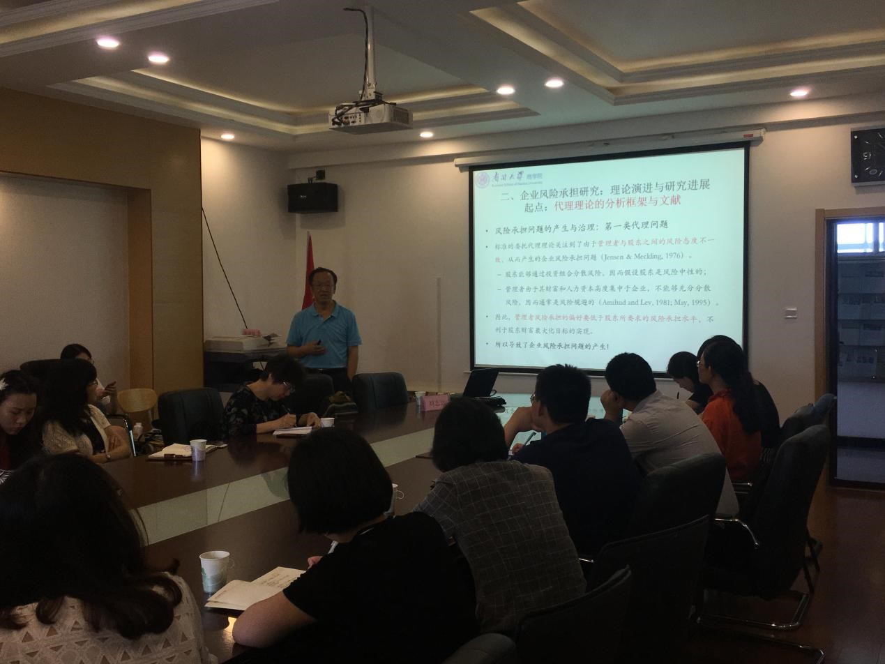 会议围绕一个问题展开——什么是企业风险。刘教授给同学们的解答是:企业风险是企业风险承担中的风险系指数收益的不确定性!而且,这就意味着,风险与收益永远如影随形。而企业本质上就是一个通过承担风险而获利的组织。刘教授在会议中基于代理问题对企业风险承担进行研究,以及对企业风险承担研究的未来进行了若干思考。